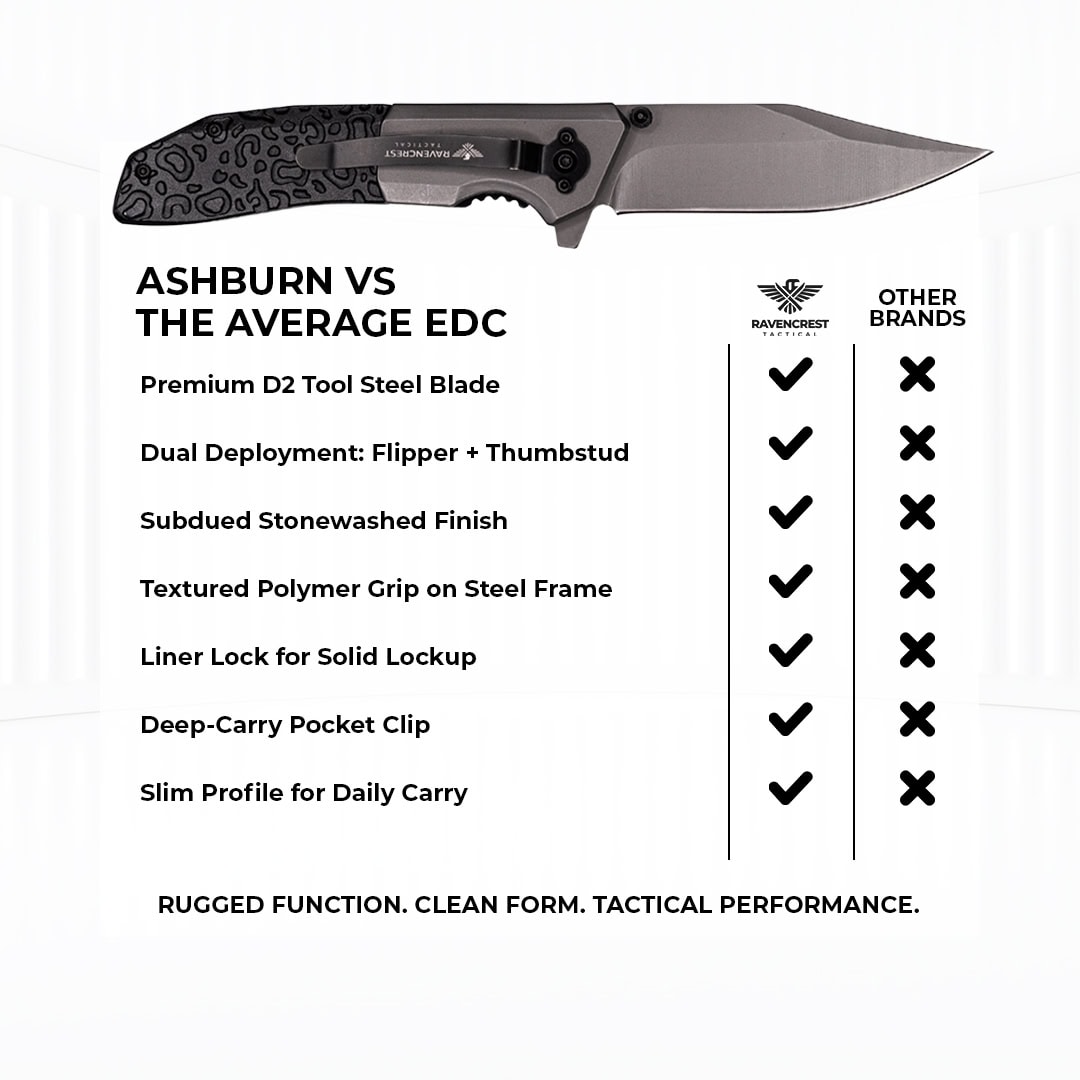 The Ashburn Folding Knife is where style meets steel — blending clean tactical lines with a bold, modern aesthetic. Built for daily carry but designed to stand out, the Ashburn brings edge, attitude, and all-day performance to your pocket.